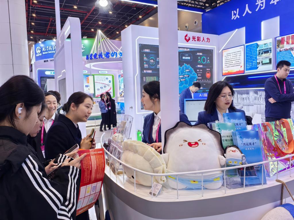 與會者在大連市光彩就業服務有限公司展位參觀交流。(受訪單位供圖)